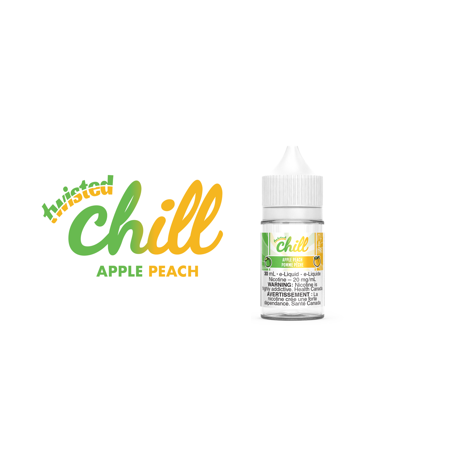 Apple Peach – Chill Twisted Salt: Transport yourself to an orchard in the summertime with the irresistible flavour of crisp, tart green apples and succulent, juicy peaches perfectly mixed together and finished with notes of sparkling candy twisted to perfection.