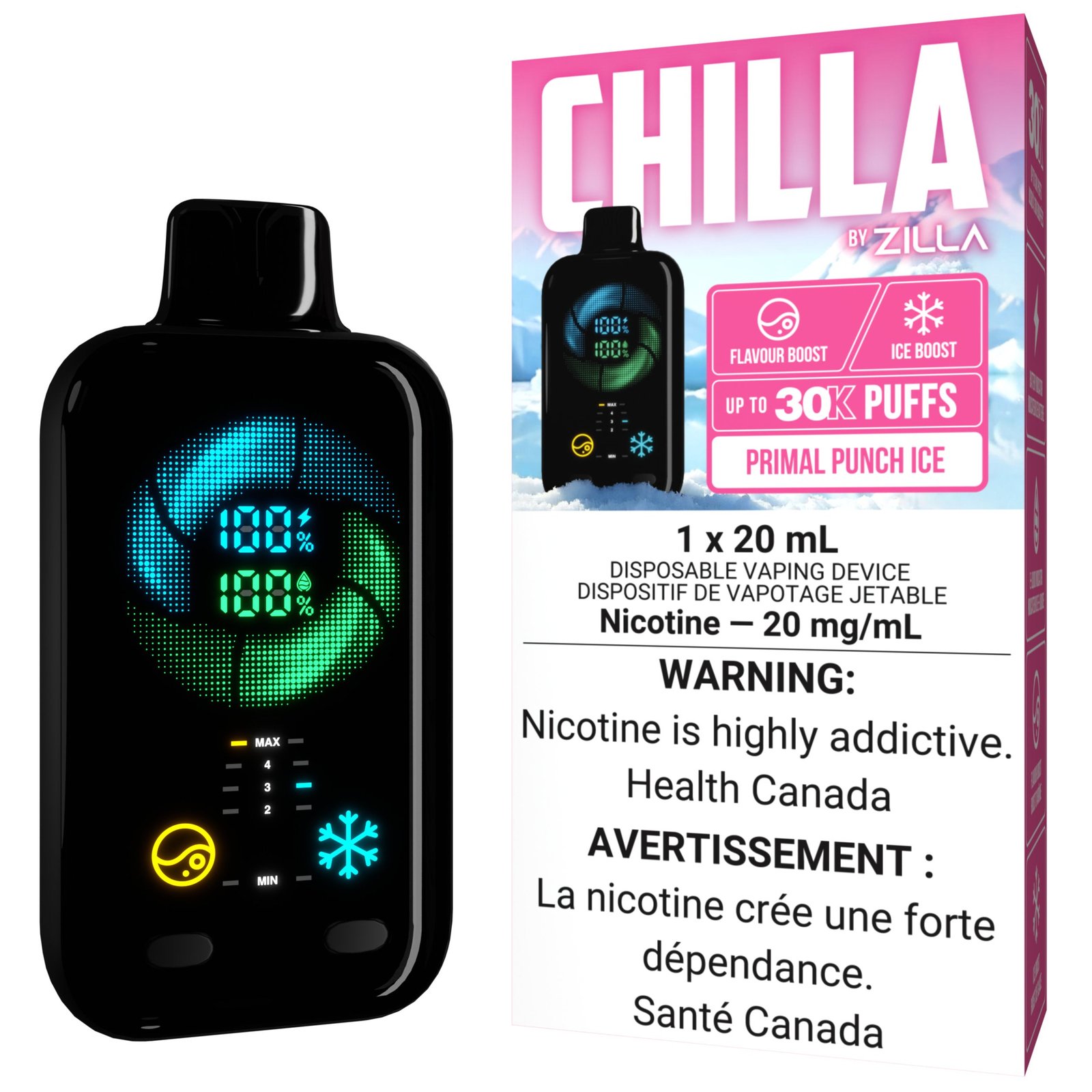 Take control of your vaping experience with CHILLA BY ZILLA’s innovative flavour and ice boost buttons. Adjust your flavour intensity with the right-side button or enhance the icy coolness with the left-side button—each offering five adjustable levels to match your mood and preference.
