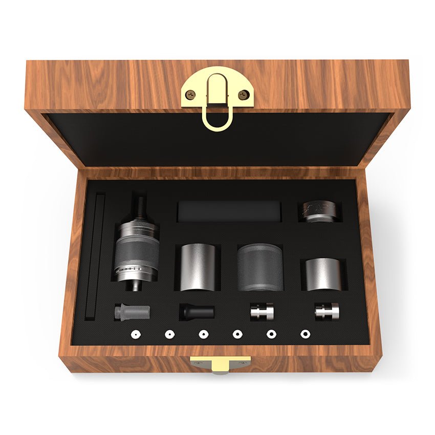 The Expromizer V1.4 MTL RTA is an improved version of the Expromizer V1 RTA designed specifically for MTL vaping. The top filling method allows you to swiftly and simply replenish the tank, and the top cap has a bayonet lock. The airflow can be precisely controlled, and there are six airflow pins included in the kit to provide a flawless draw and flavour. Furthermore, both the top cap and the airflow ring have knurling for a secure grip. Many extra spare parts are included in the kit, including three different drip tips and four different tank variations. The Expromizer V1.4 MTL RTA will be shipped in a stunning wooden box as part of a limited edition.