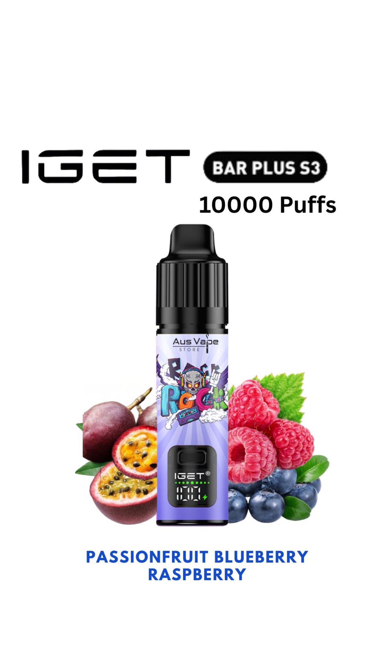 1 x iGet Bar Plus S3 Pod & Battery Base – Passion Fruit Blueberry Raspberry (Type-c cable not included)