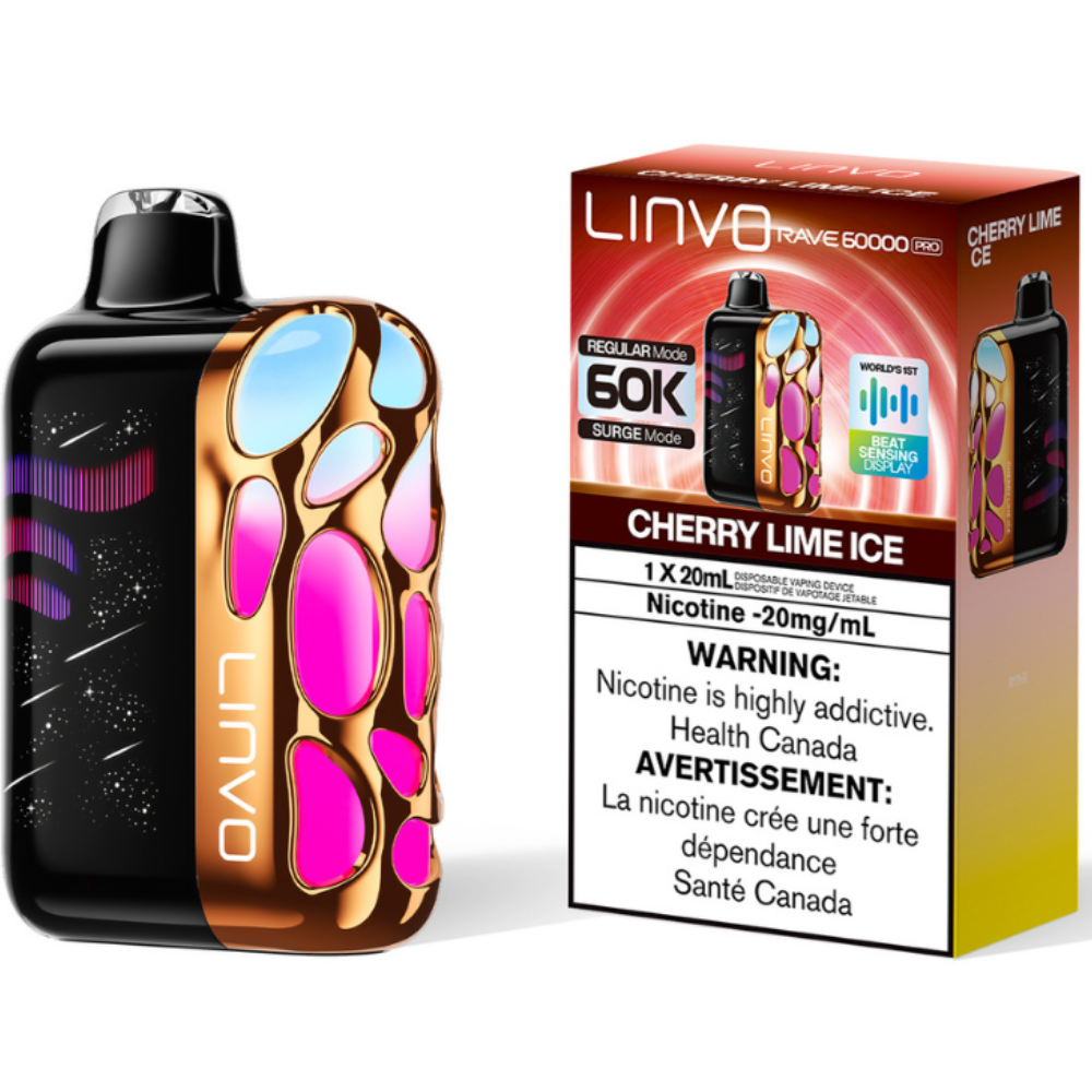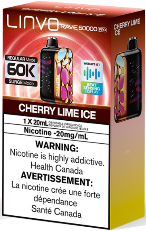 Cherry Lime Ice by Linvo Rave 60000 Pro: Prepare for a citrus-cherry chill. Cherry Lime Ice by Linvo Rave 60000 Pro unites juicy red cherries with zesty lime and an arctic blast of ice. Sweet yet sharp, this flavour profile electrifies the taste buds and finishes with a cooling exhale that refreshes from start to finish.