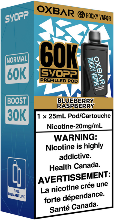 Blueberry Raspberry by Rocky Vapor Oxbar Svopp 60K: Bursting with vibrancy, Blueberry Raspberry by Rocky Vapor Oxbar Svopp 60K fuses the deep, juicy notes of blueberries with the tangy brightness of raspberries for a rich berry blend.