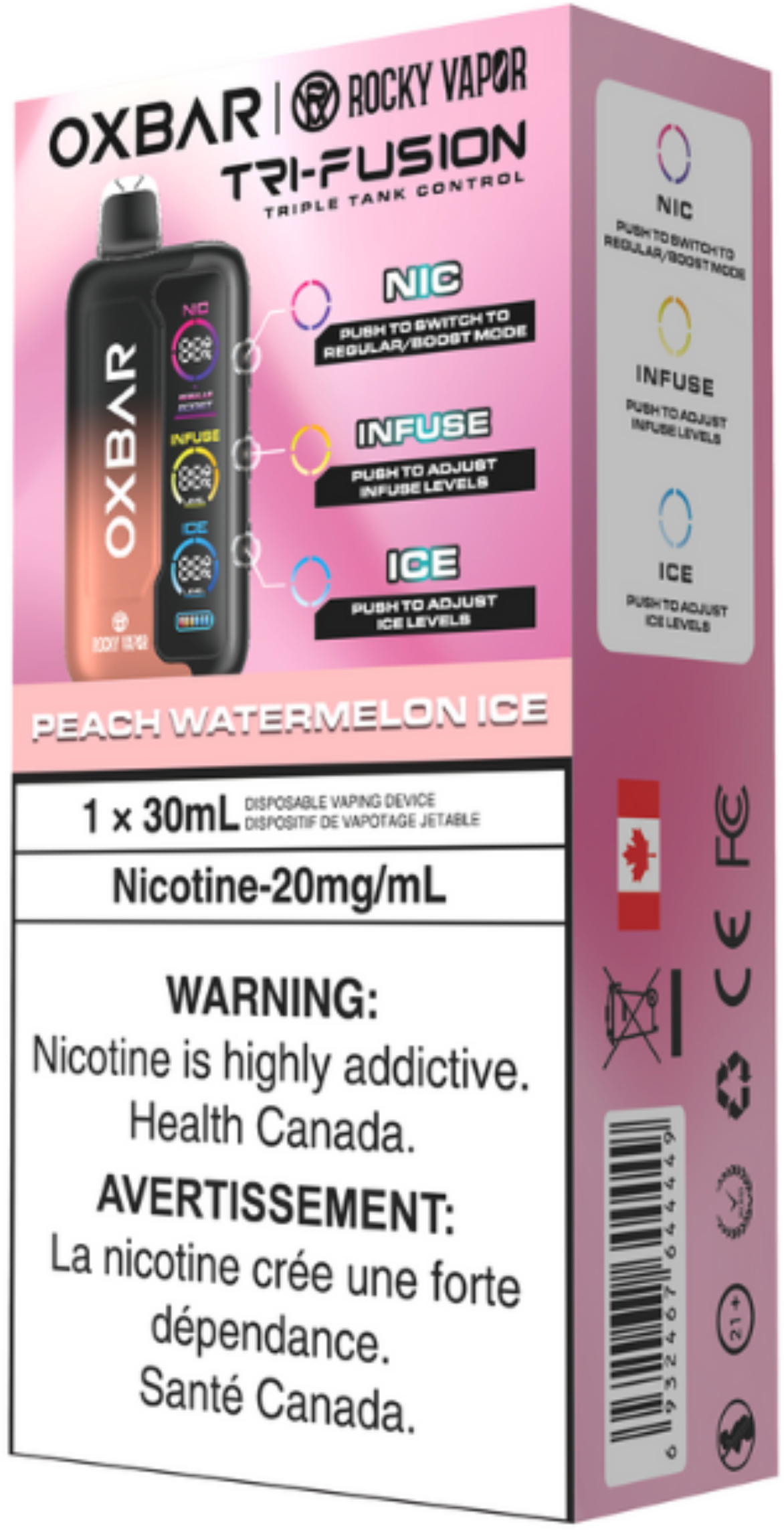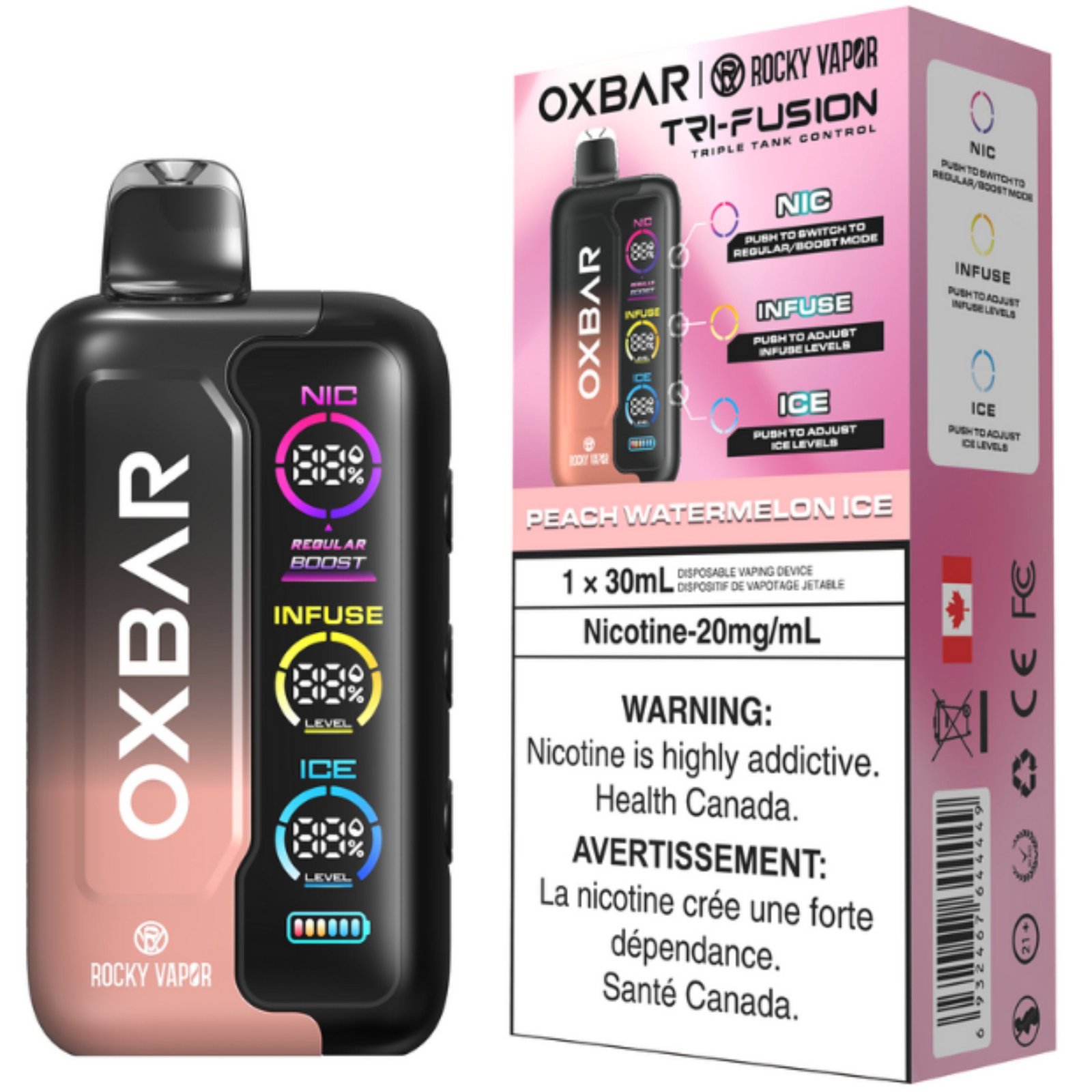 Peach Watermelon Ice by Rocky Vapor Oxbar Tri Fusion: Sweet, juicy, and chilled to perfection—Peach Watermelon Ice by Rocky Vapor Oxbar Tri Fusion is a summer classic reborn. Mouthwatering peach and refreshing watermelon combine in a beautifully balanced vape, finished with a cool menthol twist for that fresh exhale you’ll crave all day.