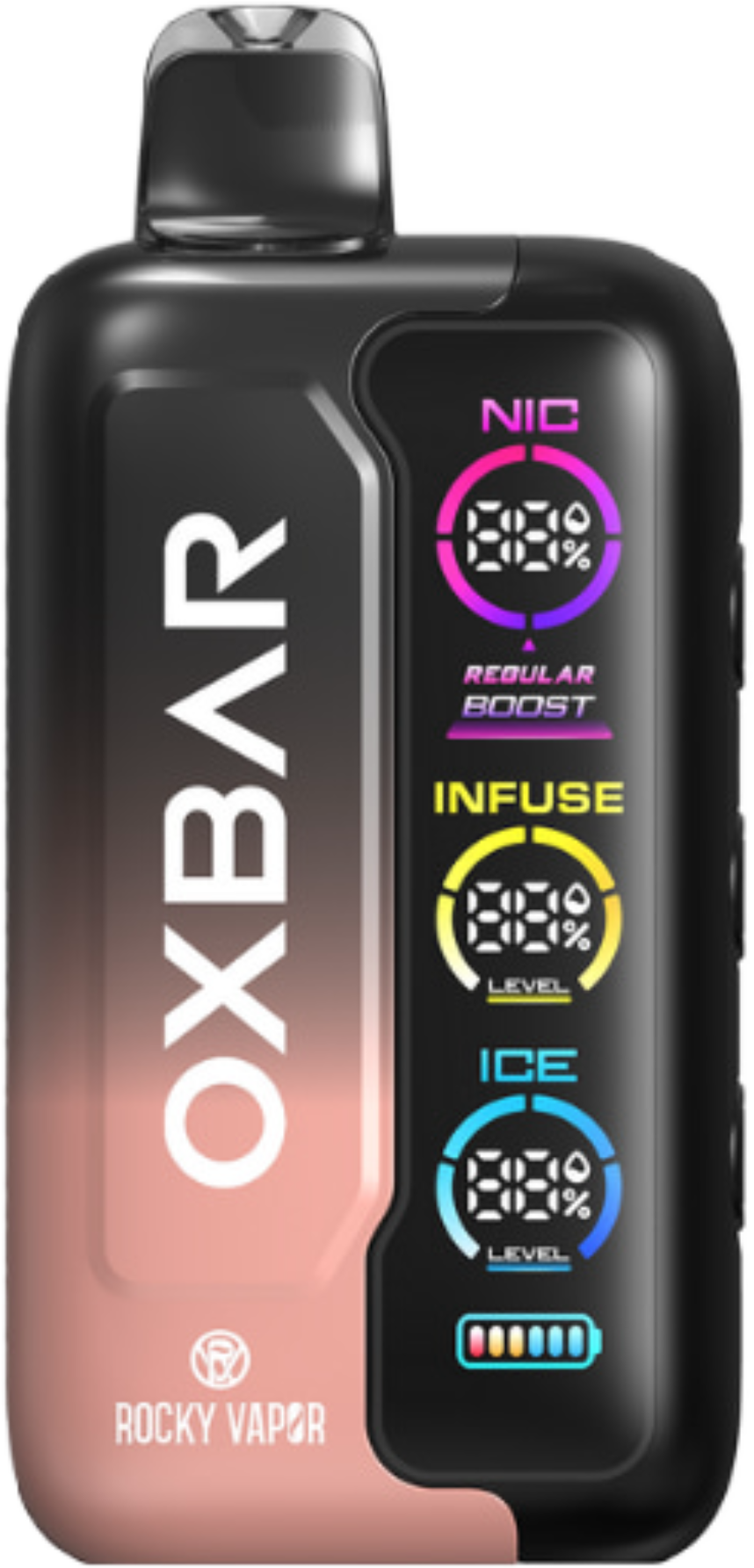 At the heart of the Rocky Vapor Oxbar Tri Fusion lies its revolutionary Triple Tank Control System with 3 intuitive button settings—NIC, INFUSE, and ICE—each giving you direct control over a separate aspect of your vape. Adjust NIC to modify the nicotine strength, INFUSE to intensify or mellow the flavour, and ICE to fine-tune the cooling sensation. With the Oxbar Tri Fusion, you’re not just vaping—you’re crafting your perfect draw with every press.