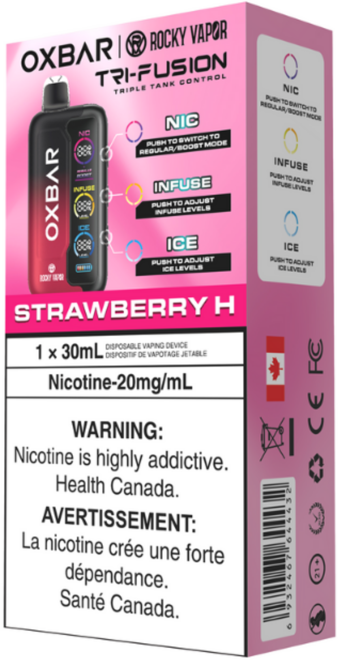Strawberry H by Rocky Vapor Oxbar Tri Fusion: Bursting with fresh strawberry flavour, Strawberry H by Rocky Vapor Oxbar Tri Fusion is a classic reimagined. Think ripe, juicy strawberries with a hint of sweetness—lush, aromatic, and utterly delicious. This one’s all about pure fruit pleasure in every puff.