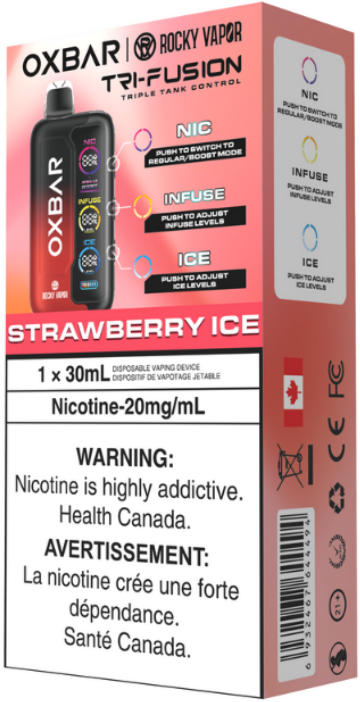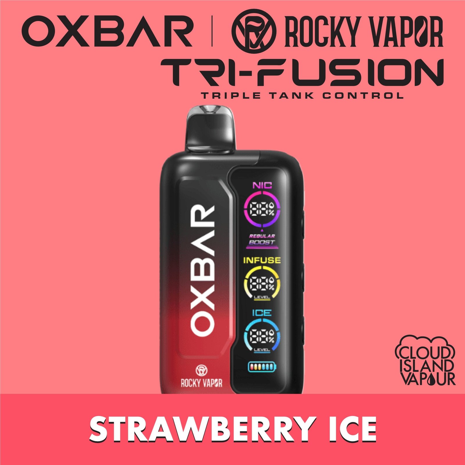 Strawberry Ice by Rocky Vapor Oxbar Tri Fusion: Cool meets classic in Strawberry Ice by Rocky Vapor Oxbar Tri Fusion. Luscious strawberries are elevated by a crisp menthol exhale, giving you that perfect balance of fruity sweetness and refreshing chill. It’s a frozen strawberry treat you can vape all day.