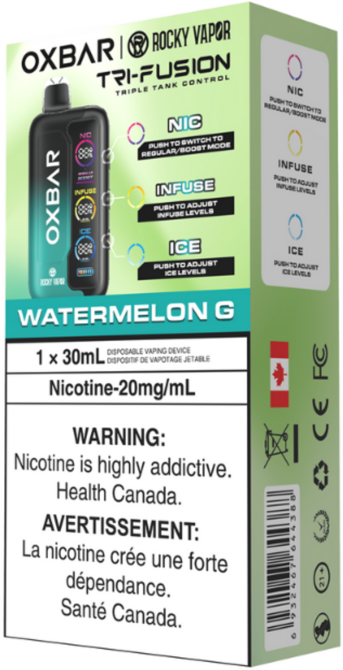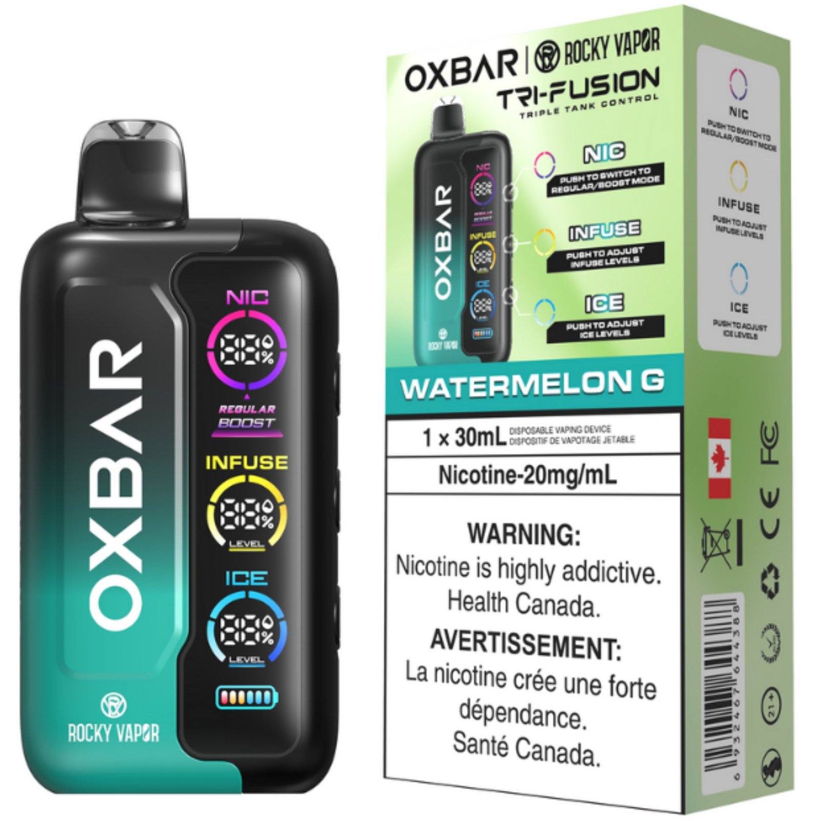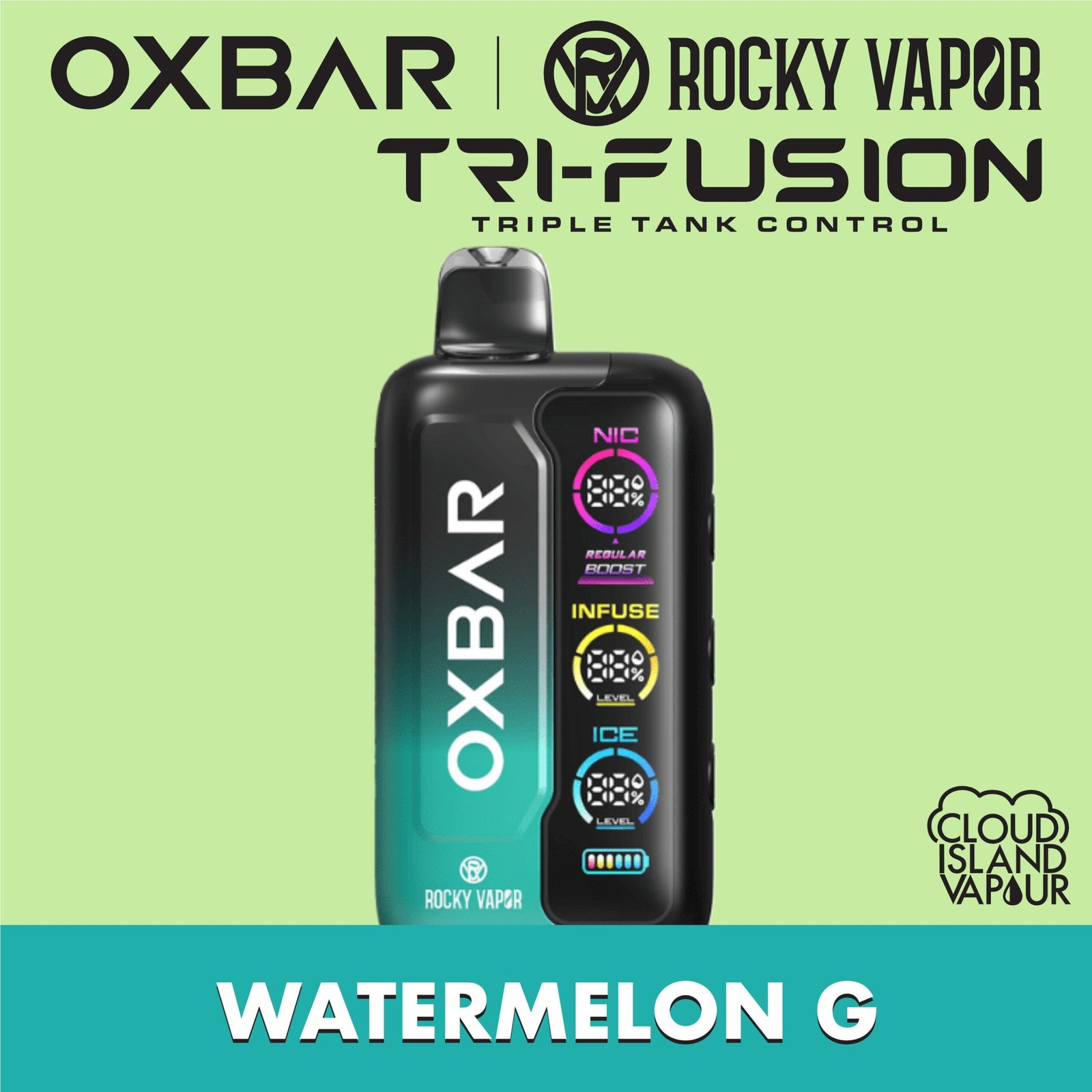 Watermelon G by Rocky Vapor Oxbar Tri Fusion: Juicy, bold, and undeniably smooth—Watermelon G by Rocky Vapor Oxbar Tri Fusion is your go-to for a vibrant summer vape. Bursting with fresh watermelon flavour and just a touch of sweetness, it delivers a refreshingly clean taste that’s both light and satisfying.