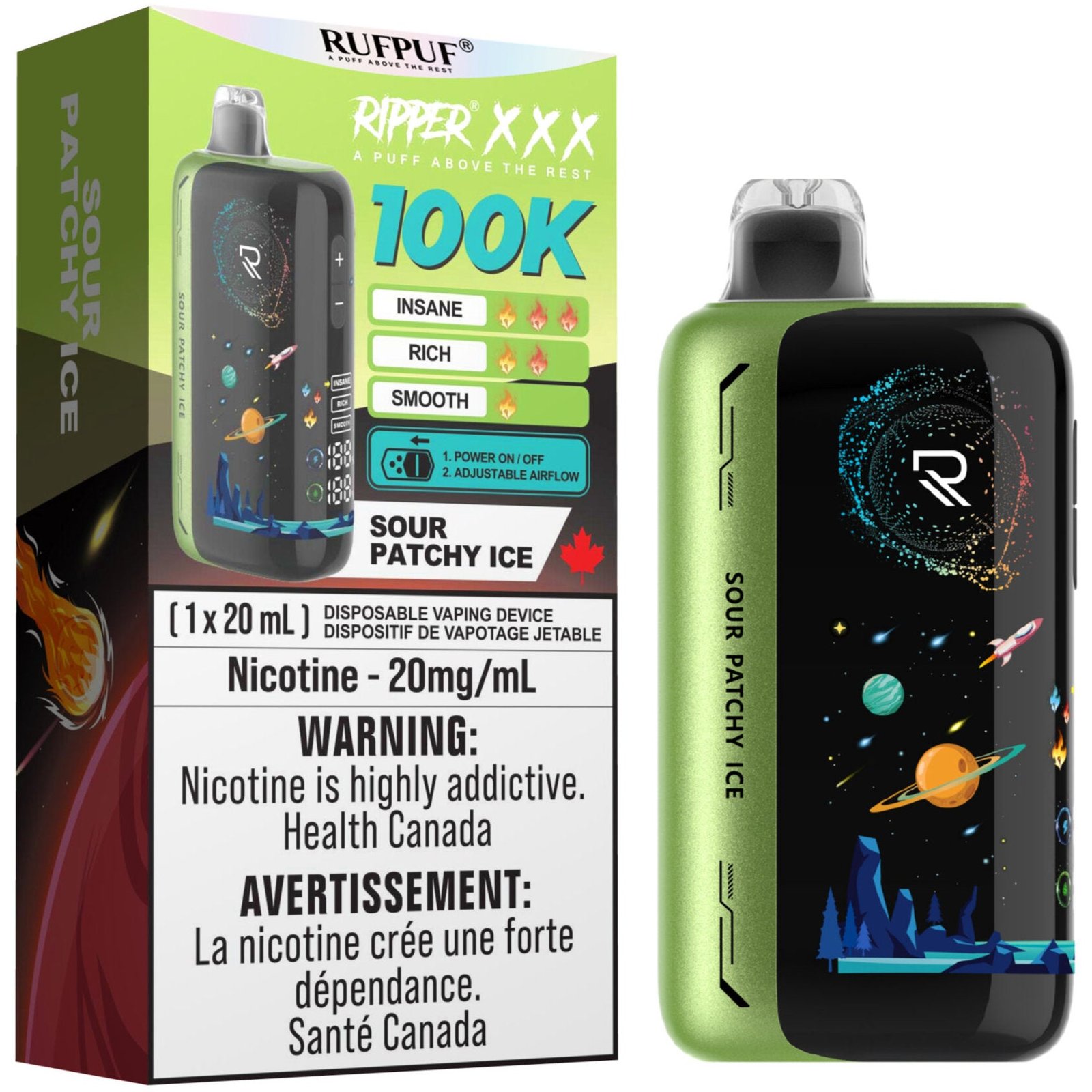 Sour Patchy Ice by RUFPUF RIPPER XXX 100K: Tangy, zesty, and refreshingly cool, Sour Patchy Ice by RUFPUF RIPPER XXX 100K is a dynamic flavour that blends sour and sweet notes with a frosty finish. Each puff delivers a lively balance of sharpness and smooth chill.