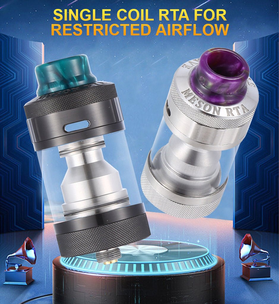 Meson RTA is a single coil RTA for restricted airflow for 20-50W. It is leakproof with top airflow adjustment. The honeycomb airflow will hit coil directly. Meson RTA has 5ml/6ml e-liquid capacity, can match with Hadron Lite and Hadron Mini perfectly. Inside the chamber, find a postless built deck designed for single coil configurations to result in restricted airflow and operation from 20 to 50 watts. The adjustable top airflow system ensures pure flavor production, while the leakproof design helps to prevent any unwanted mess. And this compact RTA has a reduced chamber size for faster vapor production and honeycomb air slots for versatility.