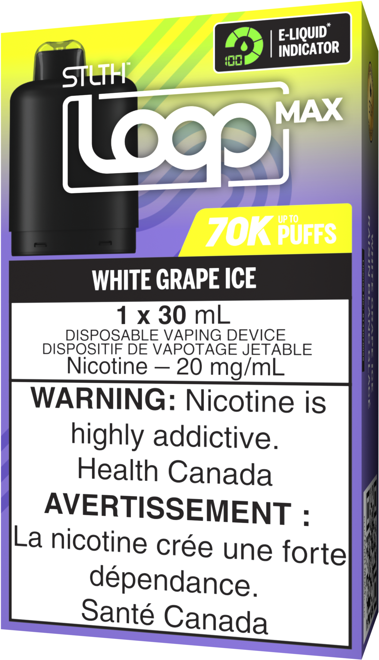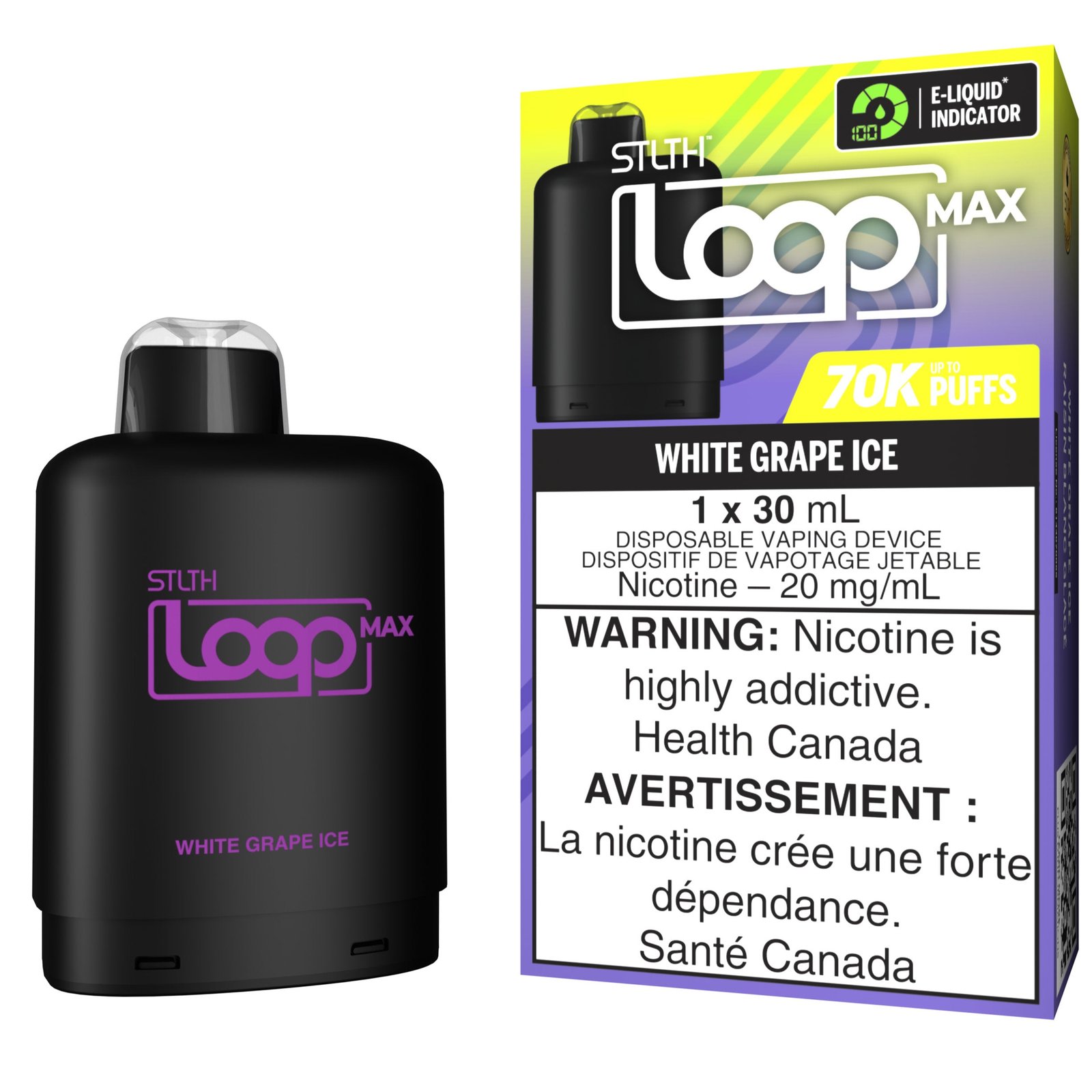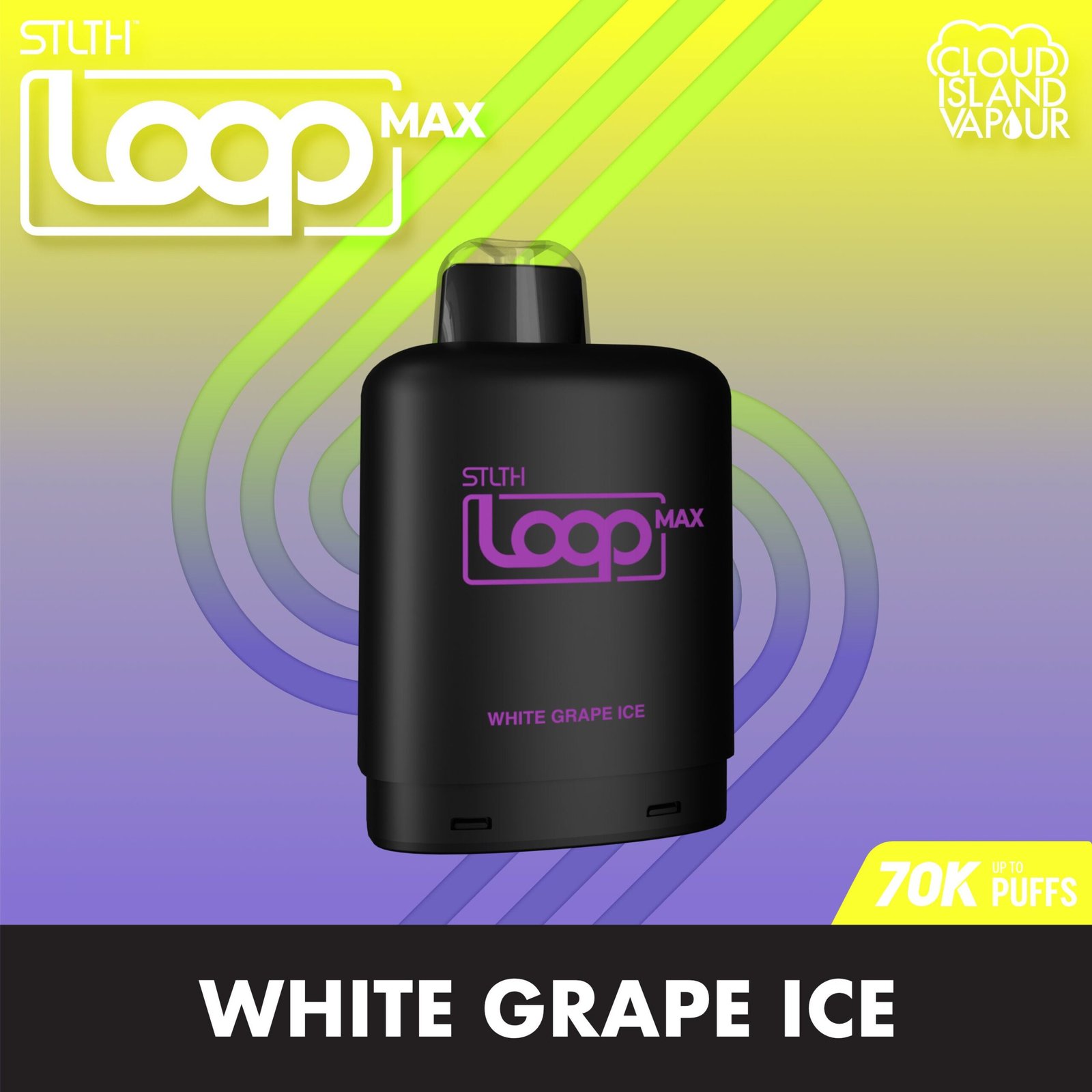 White Grape Ice by STLTH LOOP MAX: A luxuriously smooth and crisp white grape flavour, enhanced with an icy cool finish. Sweet, slightly tart, and bursting with juicy freshness, White Grape Ice by STLTH LOOP MAX delivers a sophisticated vaping experience with every puff.